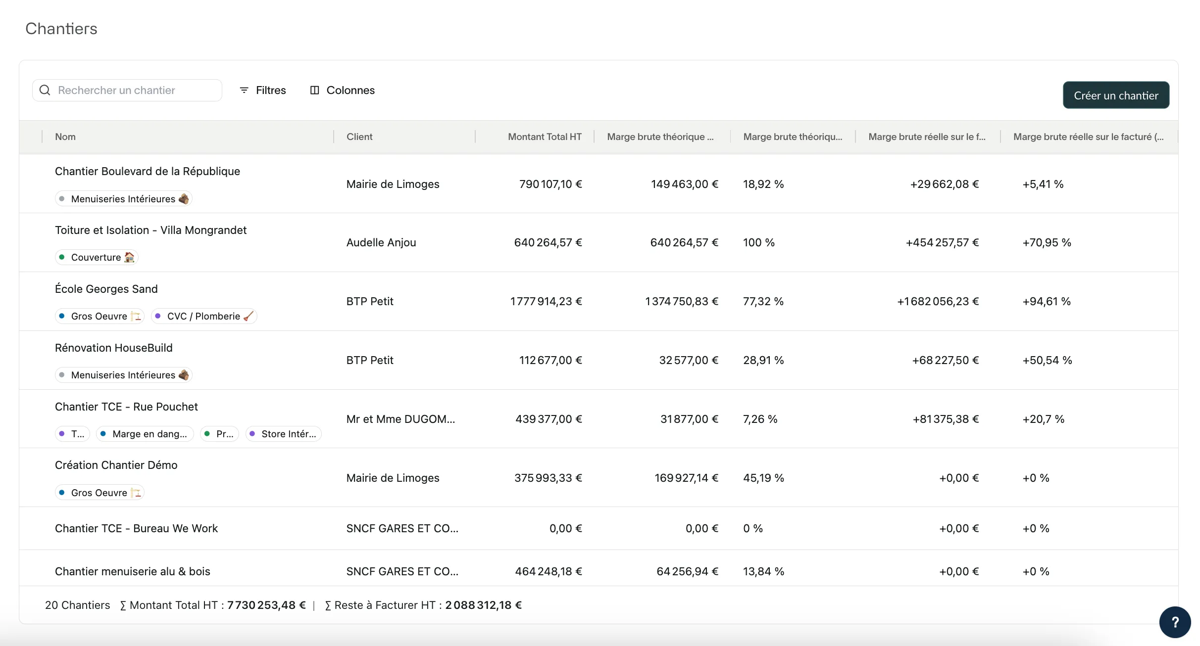 Analysez la rentabilité de vos chantiers grâce à une vue d'ensemble personnalisée